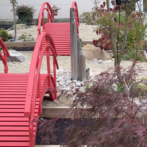 To achieve an authentic yet modern aesthetic, our team worked with existing border structures as the foundation for a more elevated design. We introduced a selection of themed specimen trees to provide varied texture and height, while a stylish central water feature serves as the garden's rhythmic centre. A Maldon shell decorative binder was chosen for the ground cover, providing a crisp, neutral palette that allows the vibrant red of the ornamental features to stand out with clarity.